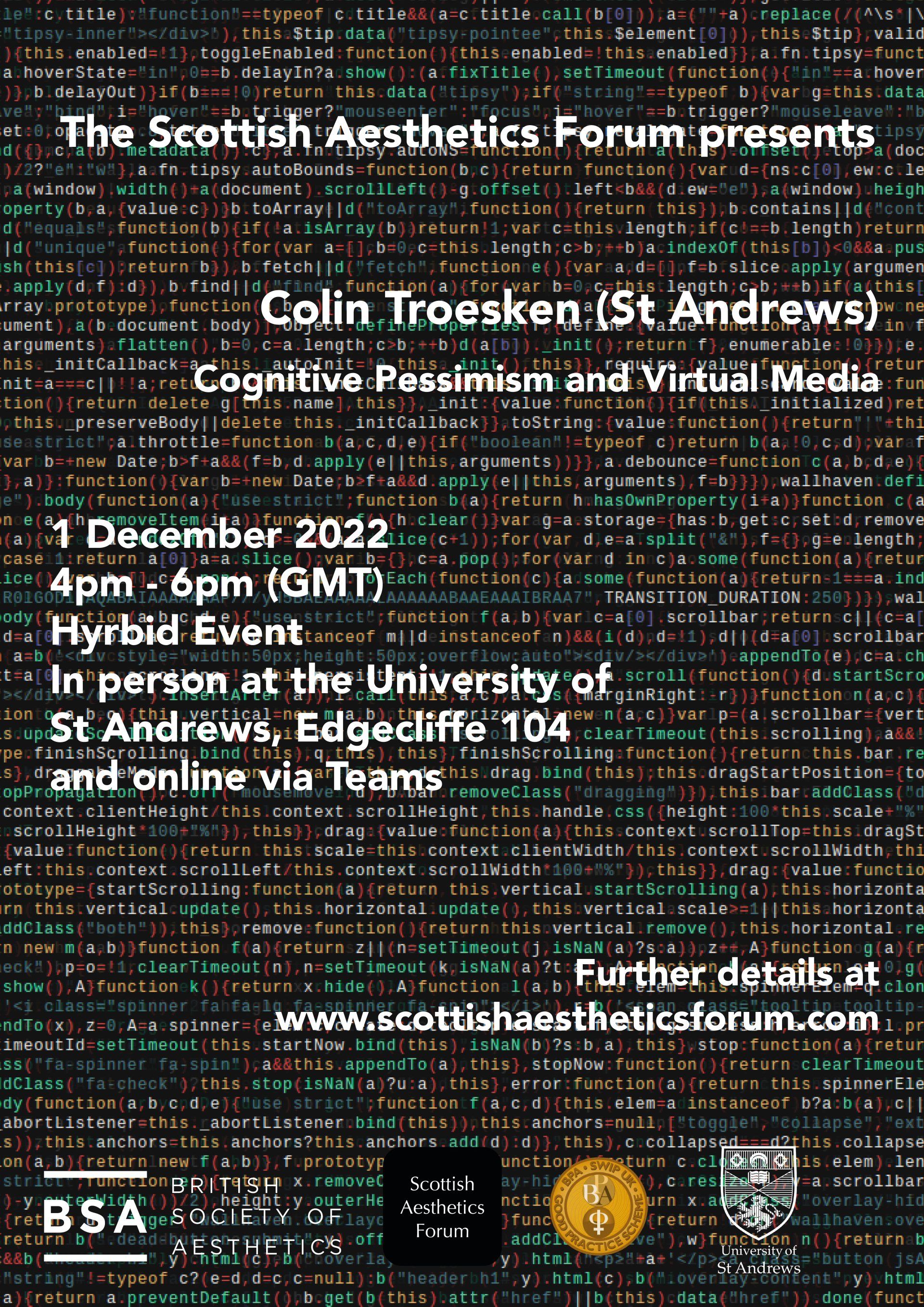 Virtual artworks (videogames, VR pieces, augmented reality pieces, etc.) are subject to what I call cognitive pessimism. Approximately, cognitive pessimism holds that certain art-kinds (in this case, virtual art) put audiences in cognitively vulnerable positions, and can be devalued as art accordingly. In this talk, I argue that virtual artworks do not necessarily put their users in cognitively unfavorable positions. This claim might strike you as banal and obvious, but I will argue that its success has interesting consequences for art-criticism broadly. This talk will be divided into three sections. The first section argues that cognitive pessimism is a philosophically defensible position and can be articulated without the use of causal language. Specifically, cognitive pessimism in its most persuasive form holds that properly appreciating virtual artworks requires a pernicious shift in our sub-doxastic attitudes. The second section argues that this position fails on two grounds: that this shift in sub-doxastic attitudes might not be required to appreciate all virtual artworks, and that this shift can be the site of cognitive value. The final section argues that the failure of cognitive pessimism might be reason for art critics to be more attentive to the potential cognitive effects of individual artworks.